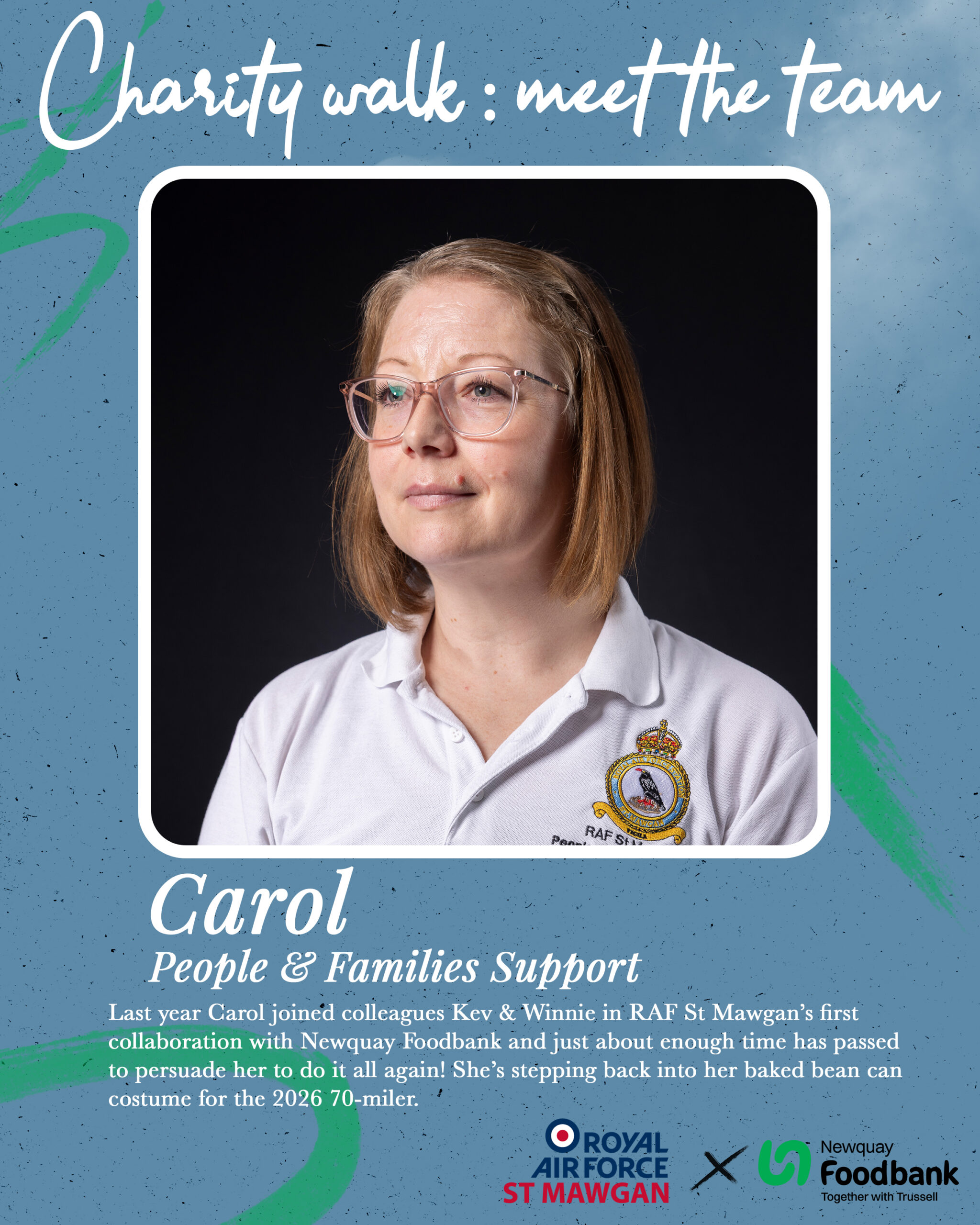 We’re on a countdown to a second epic challenge in collaboration with RAF St Mawgan to raise funds and awareness for local foodbanks. In the middle of March, a team of military and civilian personnel from the base will team up with us to walk over 70 miles across 3 days. Over the next couple of weeks, we’ll introduce you to some of the group looking to build on the success of last year’s walking challenge.